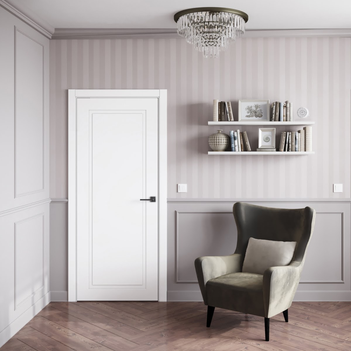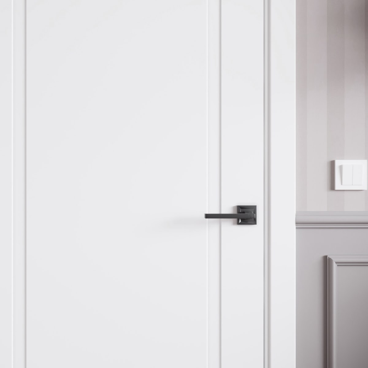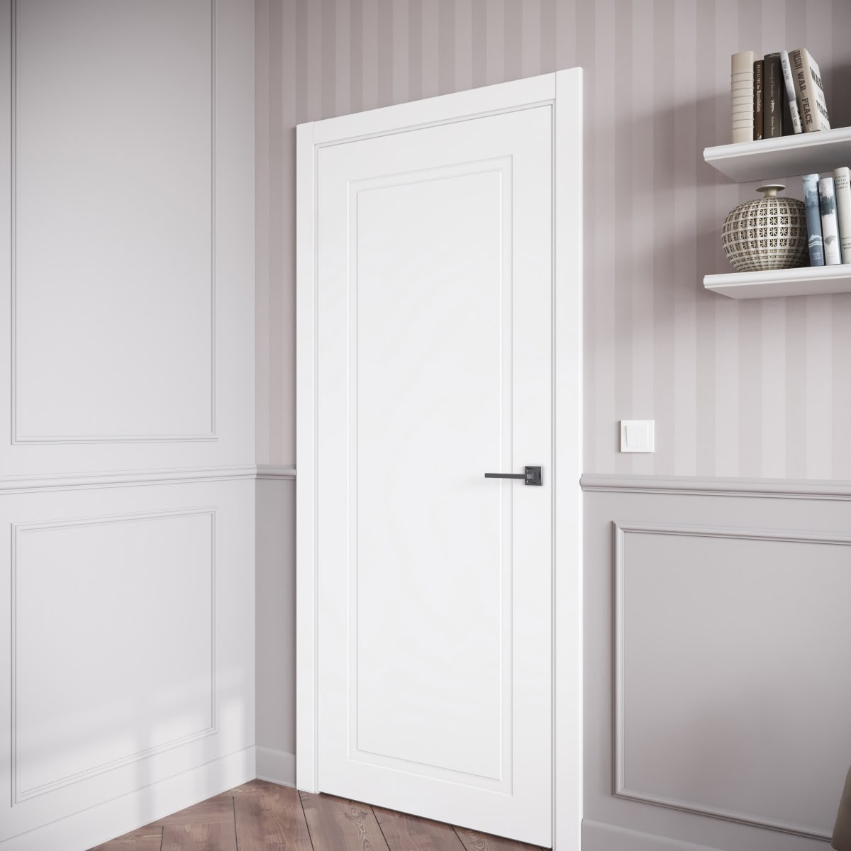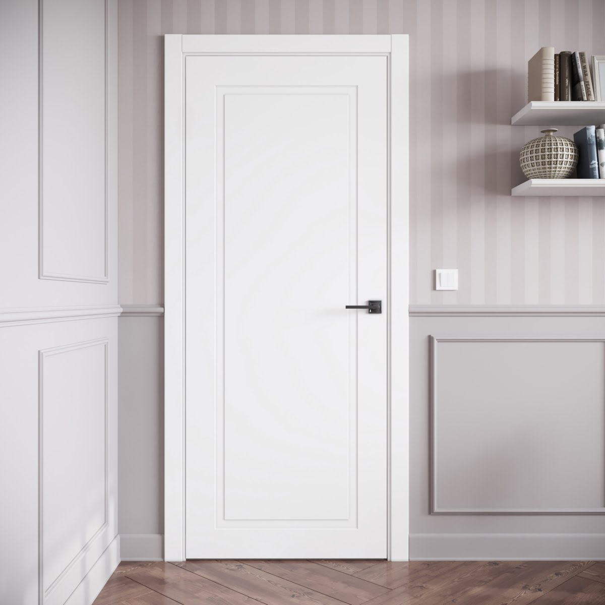 Межкомнатная фрезерованная каркасная дверь, покрытая эмалью белого цвета (RAL 9003), глухая. Полотно изготовлено из срощенного бруса сосны, МДФ и сотового наполнителя. Толщина: 38 мм. Дверная коробка с телескопическим наличником входит в комплект. Возможно изготовление дверей нестандартных размеров.