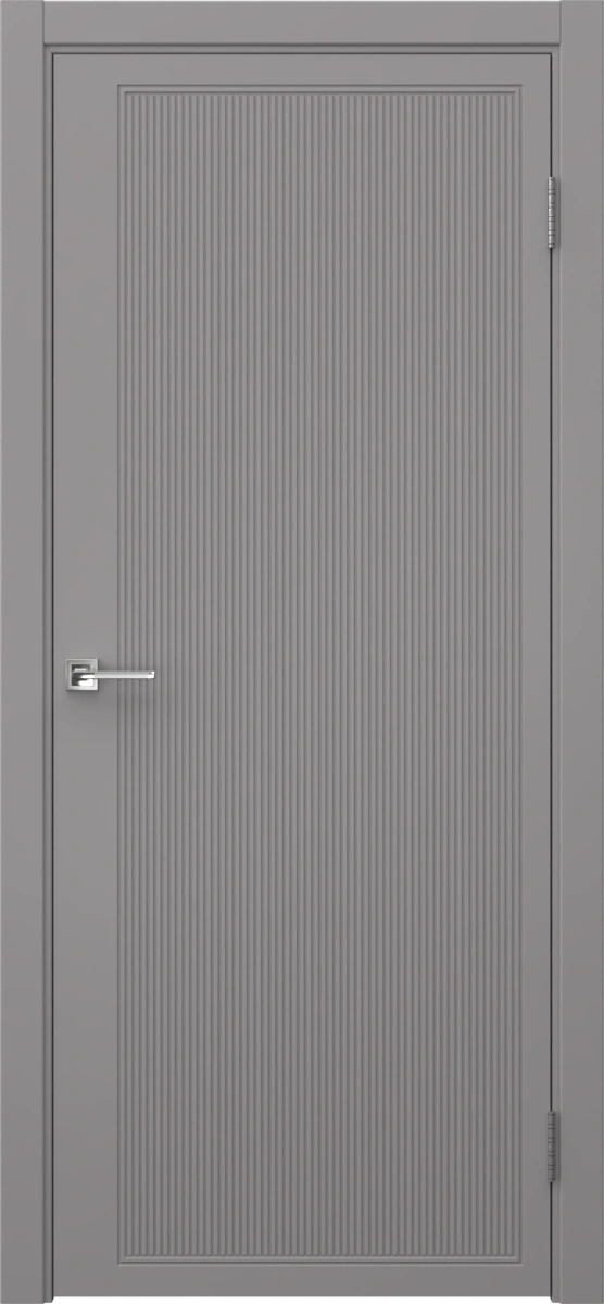 Межкомнатная фрезерованная современная каркасная дверь, покрытая эмалью в цвете RAL 7036 (платиново-серый), глухая. Изготовлена из срощенного соснового бруса, МДФ и сотового наполнителя. Толщина полотна: 38 мм. Комплектация включает в себя дверную коробку с телескопическим наличником. Под заказ производятся двери нестандартных габаритов.