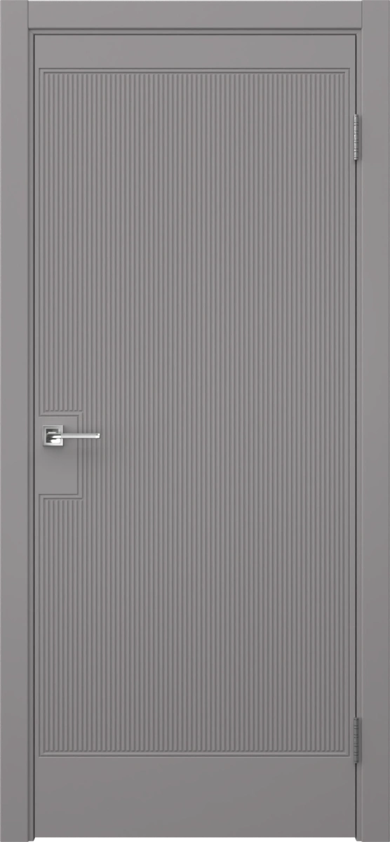 Межкомнатная фрезерованная современная каркасная дверь, покрытая эмалью в цвете RAL 7036 (платиново-серый), глухая. Полотно изготовлено из срощенного соснового бруса, сотового наполнителя и МДФ. Толщина: 38 мм. Дверная коробка с телескопическим наличником входит в комплект. Изготавливаются под заказ двери нестандартных размеров.