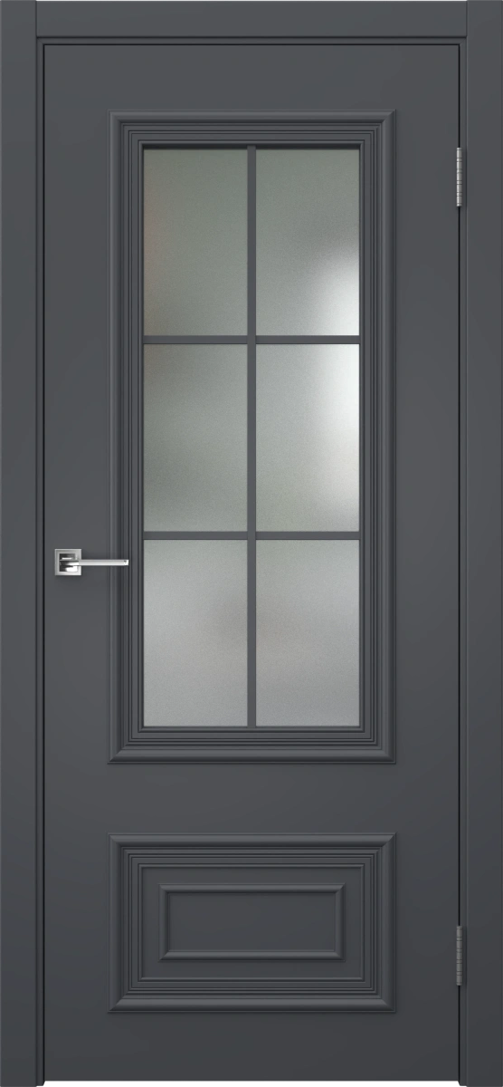 Межкомнатная классическая каркасная дверь, покрытая эмалью в цвете RAL 7012 (базальтово-серый), стекло — сатинат с решеткой. Полотно изготовлено из срощенного соснового бруса, сотового наполнителя и МДФ. Толщина: 38 мм. Дверная коробка с телескопическим наличником входит в комплект. Под заказ производятся двери нестандартных габаритов.