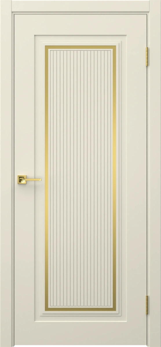 Межкомнатная фрезерованная классическая каркасная дверь, покрытая эмалью в цвете RAL 9001 (кремово-белый), глухая, с золотым молдингом. Полотно изготовлено из срощенного соснового бруса, сотового наполнителя и МДФ. Толщина: 38 мм. Комплектация включает в себя дверную коробку с телескопическим наличником. Под заказ производятся двери нестандартных габаритов.