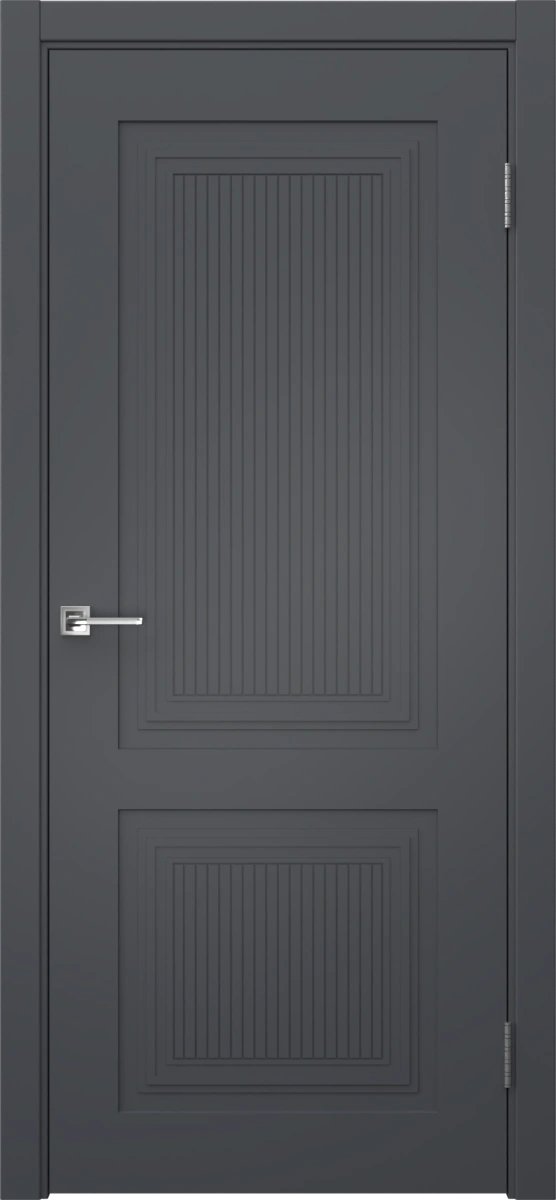 Межкомнатная фрезерованная каркасная дверь, покрытая эмалью цвета RAL 7012 (базальтово-серый), глухая. Изготовлена из срощенного соснового бруса, МДФ и сотового наполнителя. Толщина полотна: 38 мм. В комплект входит дверная коробка с телескопическим наличником. Производятся под заказ двери нестандартных размеров.