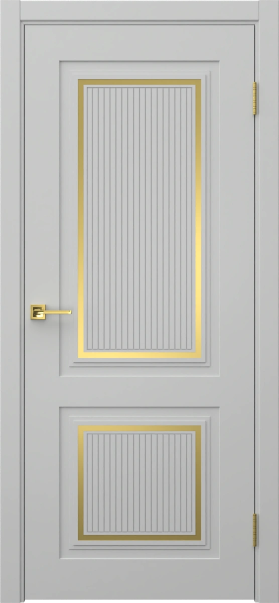 Межкомнатная фрезерованная классическая каркасная дверь, покрытая эмалью цвета RAL 7047 (телегрей 4), глухая, с золотым молдингом. Полотно изготовлено из срощенного бруса сосны, МДФ и сотового наполнителя. Толщина: 38 мм. Комплектация включает в себя дверную коробку с телескопическим наличником. Производятся под заказ двери нестандартных размеров.