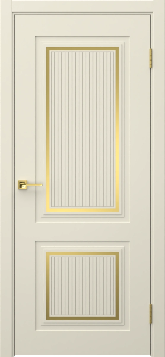 Межкомнатная фрезерованная классическая каркасная дверь, покрытая эмалью в цвете RAL 9001 (кремово-белый), глухая, с золотым молдингом. Изготовлена из срощенного бруса сосны, МДФ и сотового наполнителя. Толщина полотна: 38 мм. Комплектуется дверной коробкой с телескопическим наличником. Под заказ производятся двери нестандартных габаритов.