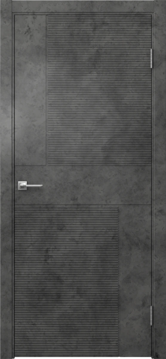 Межкомнатная фрезерованная современная каркасная дверь, покрытая экошпоном в цвете «бетон темный», глухая. Изготовлена из срощенного бруса сосны, МДФ и сотового наполнителя. Толщина полотна: 38 мм. В комплект входит дверная коробка с телескопическим наличником. Возможно изготовление дверей нестандартных размеров.