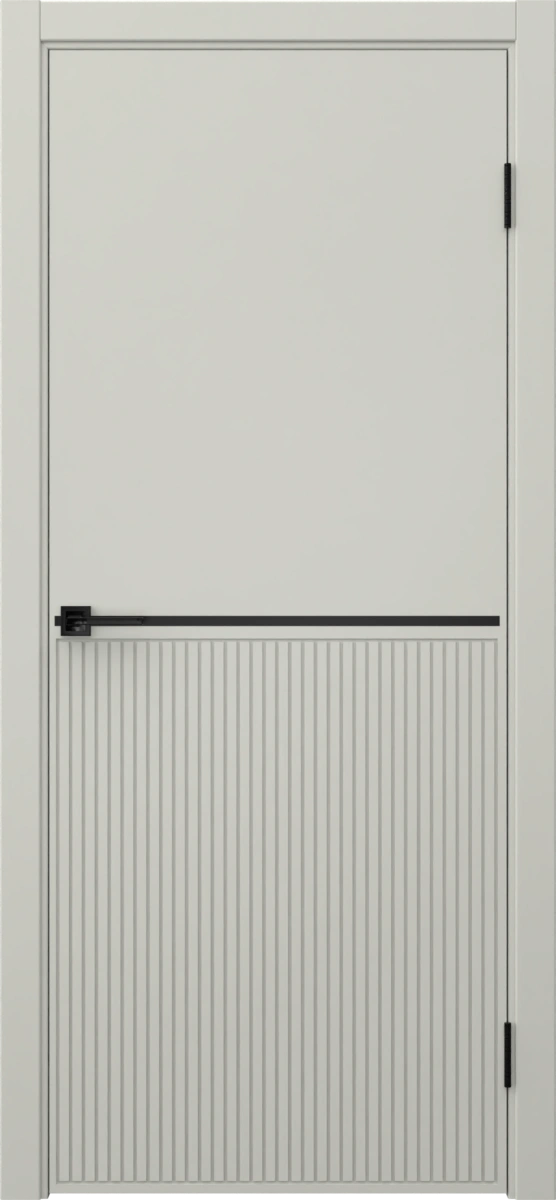 Межкомнатная фрезерованная современная каркасная дверь, покрытая эмалью цвета RAL 7044 (серый шелк), глухая, с черным пластиковым молдингом. Полотно изготовлено из срощенного соснового бруса, сотового наполнителя и МДФ. Толщина: 38 мм. Дверная коробка с телескопическим наличником входит в комплект. Возможно изготовление дверей нестандартных размеров.