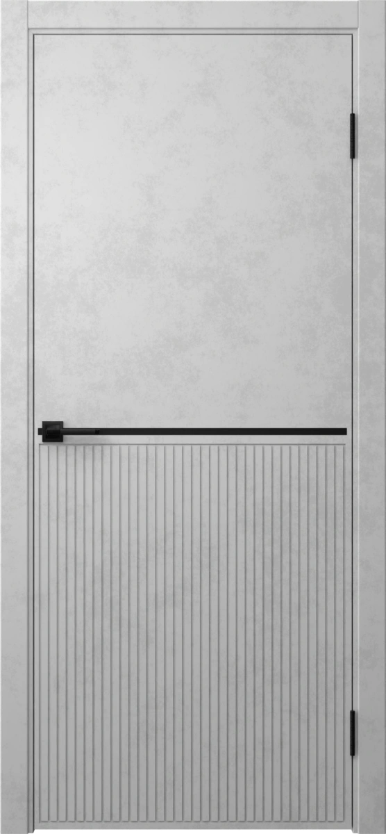 Межкомнатная фрезерованная современная каркасная дверь, покрытая экошпоном цвета «бетон светлый», глухая, с черным пластиковым молдингом. Полотно изготовлено из срощенного соснового бруса, сотового наполнителя и МДФ. Толщина: 38 мм. В комплект входит дверная коробка с телескопическим наличником. Производятся под заказ двери нестандартных размеров.