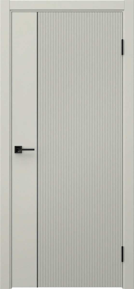 Межкомнатная фрезерованная современная каркасная дверь, покрытая эмалью в цвете RAL 7044 (серый шелк), глухая, с черным пластиковым молдингом. Изготовлена из срощенного соснового бруса, МДФ и сотового наполнителя. Толщина полотна: 38 мм. Дверная коробка с телескопическим наличником входит в комплект. Производятся под заказ двери нестандартных размеров.