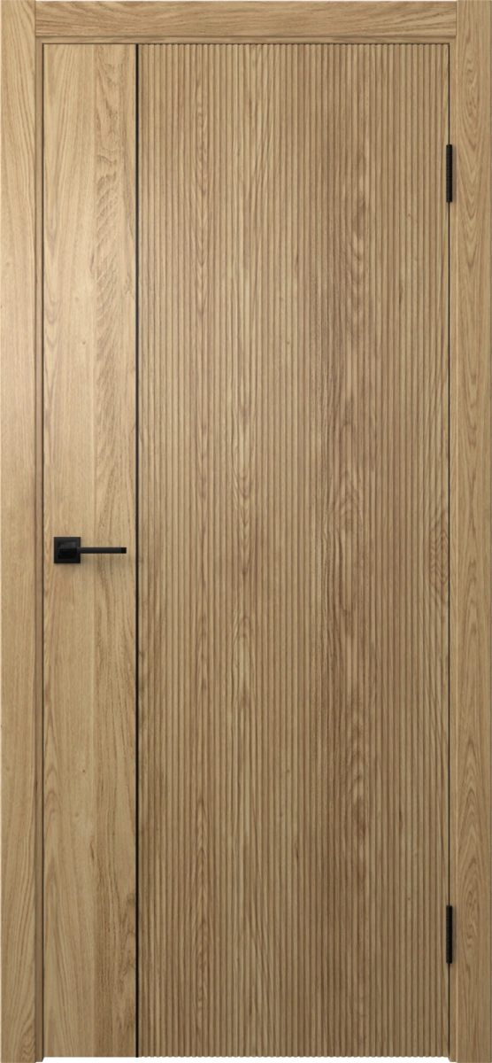 Межкомнатная фрезерованная современная каркасная дверь, покрытая экошпоном в цвете «дуб европейский соломенный», глухая, с черным пластиковым молдингом. Изготовлена из срощенного бруса сосны, МДФ и сотового наполнителя. Толщина полотна: 38 мм. В комплект входит дверная коробка с телескопическим наличником. Под заказ производятся двери нестандартных габаритов.
