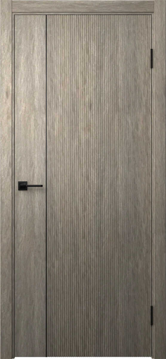 Межкомнатная фрезерованная современная каркасная дверь, покрытая экошпоном в цвете «хардвуд песочный», глухая, с черным пластиковым молдингом. Полотно изготовлено из срощенного соснового бруса, сотового наполнителя и МДФ. Толщина: 38 мм. Комплектация включает в себя дверную коробку с телескопическим наличником. Под заказ производятся двери нестандартных габаритов.