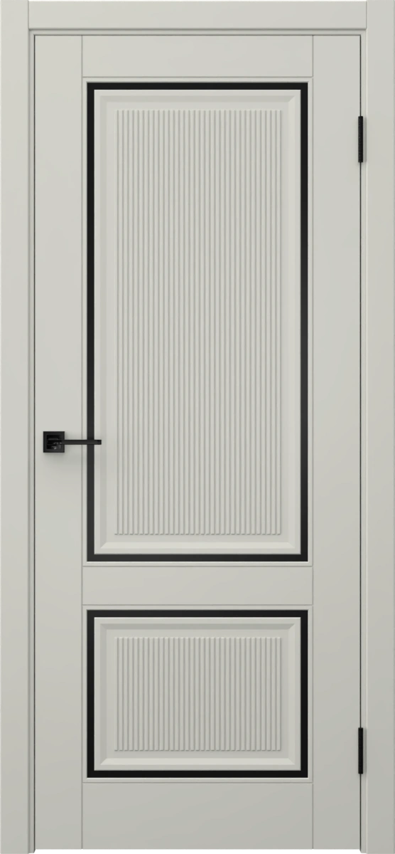 Межкомнатная фрезерованная каркасная дверь, покрытая эмалью в цвете RAL 7044 (серый шелк), глухая, с черным молдингом. Полотно изготовлено из срощенного соснового бруса, сотового наполнителя и МДФ. Толщина: 38 мм. Комплектуется дверной коробкой с телескопическим наличником. Производятся под заказ двери нестандартных размеров.