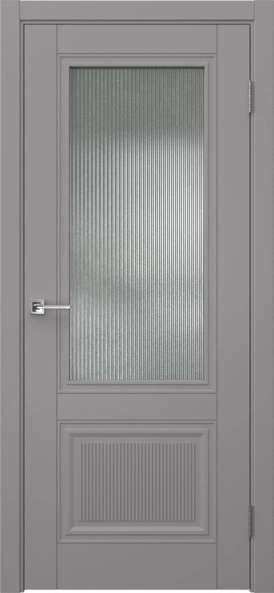 Межкомнатная фрезерованная каркасная дверь, покрытая эмалью цвета RAL 7036 (платиново-серый), с матовым рифленым стеклом. Полотно изготовлено из срощенного бруса сосны, МДФ и сотового наполнителя. Толщина: 38 мм. Дверная коробка с телескопическим наличником входит в комплект. Изготавливаются под заказ двери нестандартных размеров.
