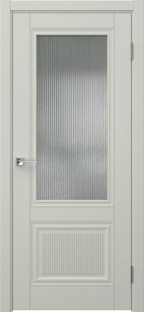 Межкомнатная фрезерованная каркасная дверь, покрытая эмалью в цвете RAL 7044 (серый шелк), с матовым рифленым стеклом. Изготовлена из срощенного соснового бруса, МДФ и сотового наполнителя. Толщина полотна: 38 мм. Дверная коробка с телескопическим наличником входит в комплект. Производятся под заказ двери нестандартных размеров.