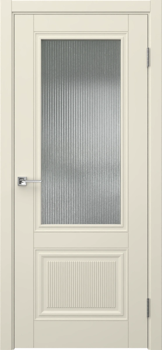 Межкомнатная фрезерованная каркасная дверь, покрытая эмалью в цвете RAL 9001 (кремово-белый), с матовым рифленым стеклом. Изготовлена из срощенного соснового бруса, МДФ и сотового наполнителя. Толщина полотна: 38 мм. Дверная коробка с телескопическим наличником входит в комплект. Возможно изготовление дверей нестандартных размеров.