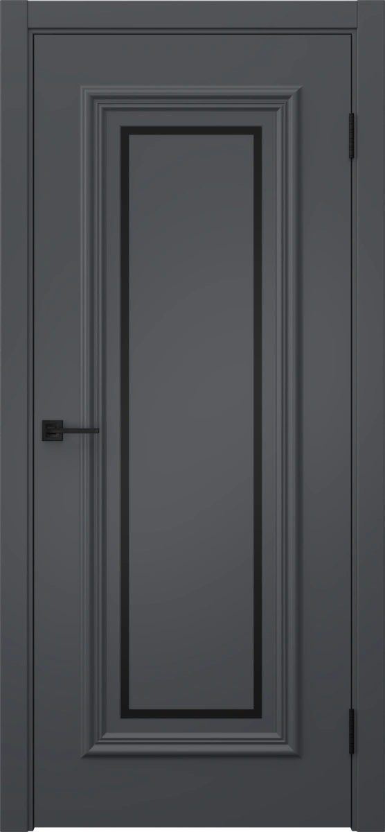 Межкомнатная классическая каркасная дверь, покрытая эмалью цвета RAL 7012 (базальтово-серый), глухая, с черным молдингом. Полотно изготовлено из срощенного соснового бруса, сотового наполнителя и МДФ. Толщина: 38 мм. Комплектуется дверной коробкой с телескопическим наличником. Под заказ производятся двери нестандартных габаритов.