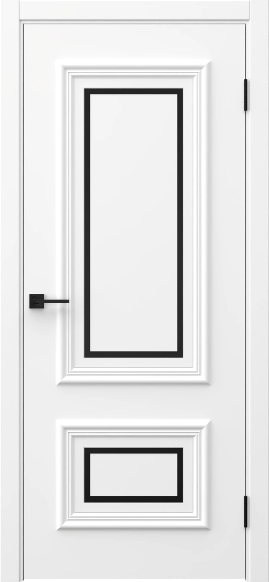 Межкомнатная классическая каркасная дверь, покрытая эмалью белого цвета (RAL 9003), глухая, с черным молдингом. Полотно изготовлено из срощенного бруса сосны, МДФ и сотового наполнителя. Толщина: 38 мм. Комплектация включает в себя дверную коробку с телескопическим наличником. Возможно изготовление дверей нестандартных размеров.