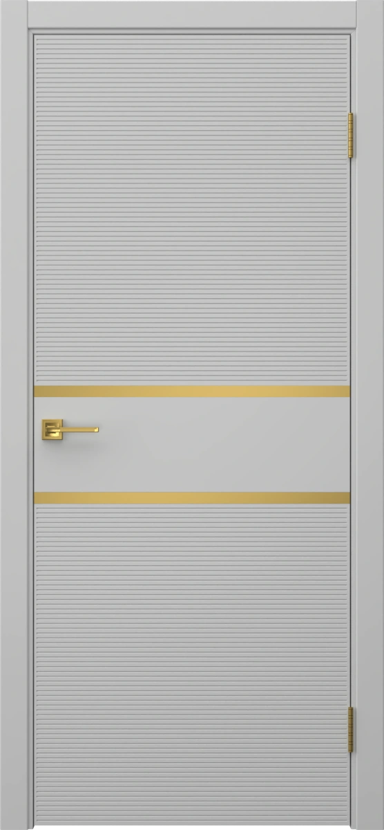 Межкомнатная современная каркасная фрезерованная дверь, покрытая эмалью в цвете RAL 7047 (телегрей 4), глухая, с золотым молдингом. Полотно изготовлено из срощенного бруса сосны, МДФ и сотового наполнителя. Комплектация включает в себя дверную коробку с телескопическими наличниками. Производятся под заказ двери нестандартных размеров.