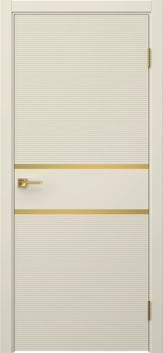 Межкомнатная современная каркасная фрезерованная дверь, покрытая эмалью цвета RAL 9001 (кремово-белый), глухая, с золотым молдингом. Изготовлена из срощенного соснового бруса, МДФ и сотового наполнителя. Комплектуется дверной коробкой с телескопическими наличниками. Возможно изготовление дверей нестандартных размеров.