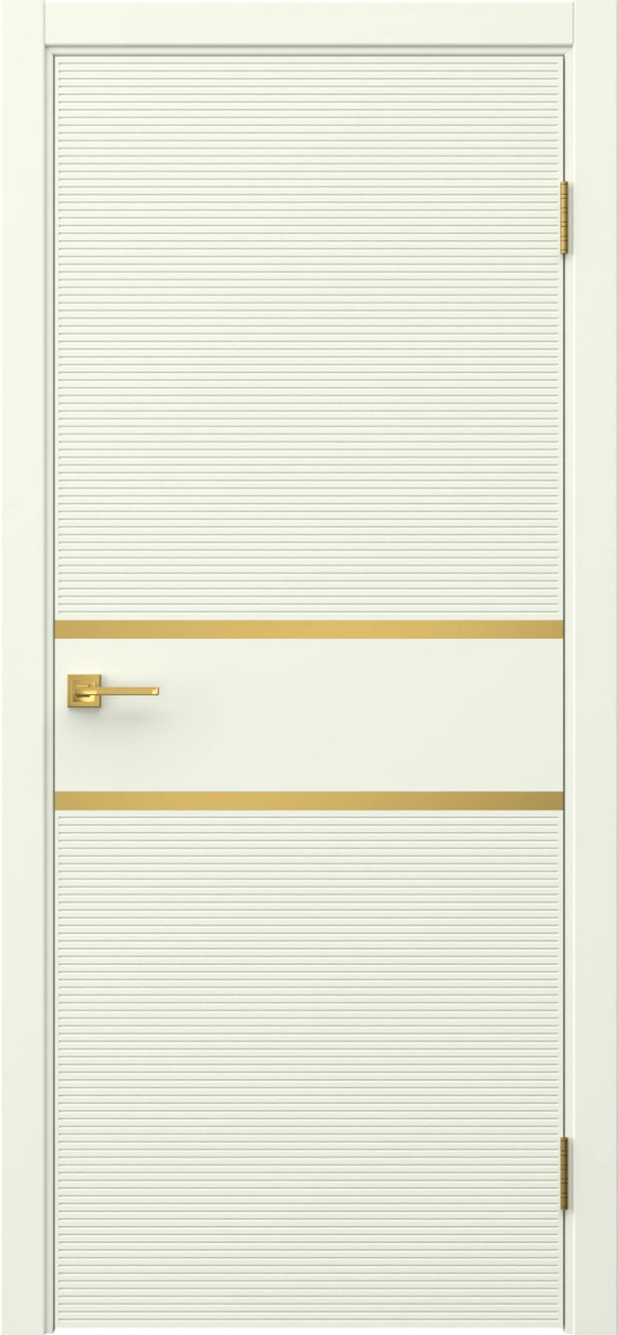Межкомнатная современная каркасная фрезерованная дверь, покрытая белой эмалью (RAL 9010), глухая, с золотым молдингом. Изготовлена из срощенного бруса сосны, МДФ и сотового наполнителя. Комплектация включает в себя дверную коробку с телескопическими наличниками. Возможно изготовление дверей нестандартных размеров.