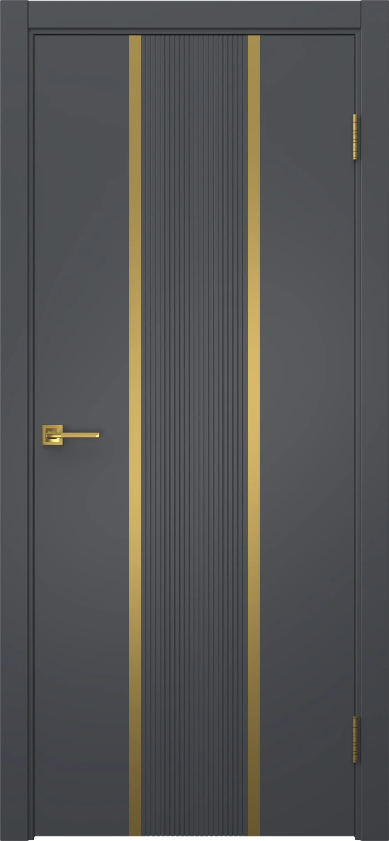 Межкомнатная современная каркасная фрезерованная дверь, покрытая эмалью в цвете «графит», глухая, с золотым молдингом. Полотно изготовлено из срощенного соснового бруса, сотового наполнителя и МДФ. Комплектуется дверной коробкой с телескопическими наличниками. Изготавливаются под заказ двери нестандартных размеров.
