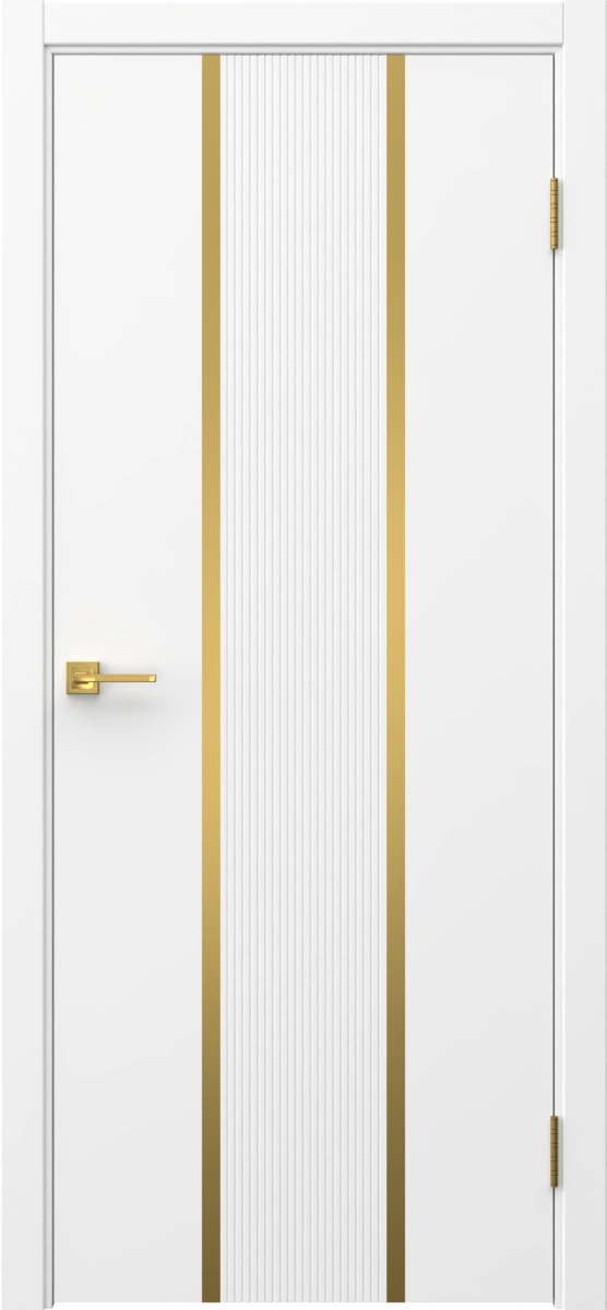 Межкомнатная современная каркасная фрезерованная дверь, покрытая эмалью белого цвета (RAL 9003), глухая, с золотым молдингом. Полотно изготовлено из срощенного соснового бруса, сотового наполнителя и МДФ. В комплект входит дверная коробка с телескопическими наличниками. Под заказ производятся двери нестандартных габаритов.