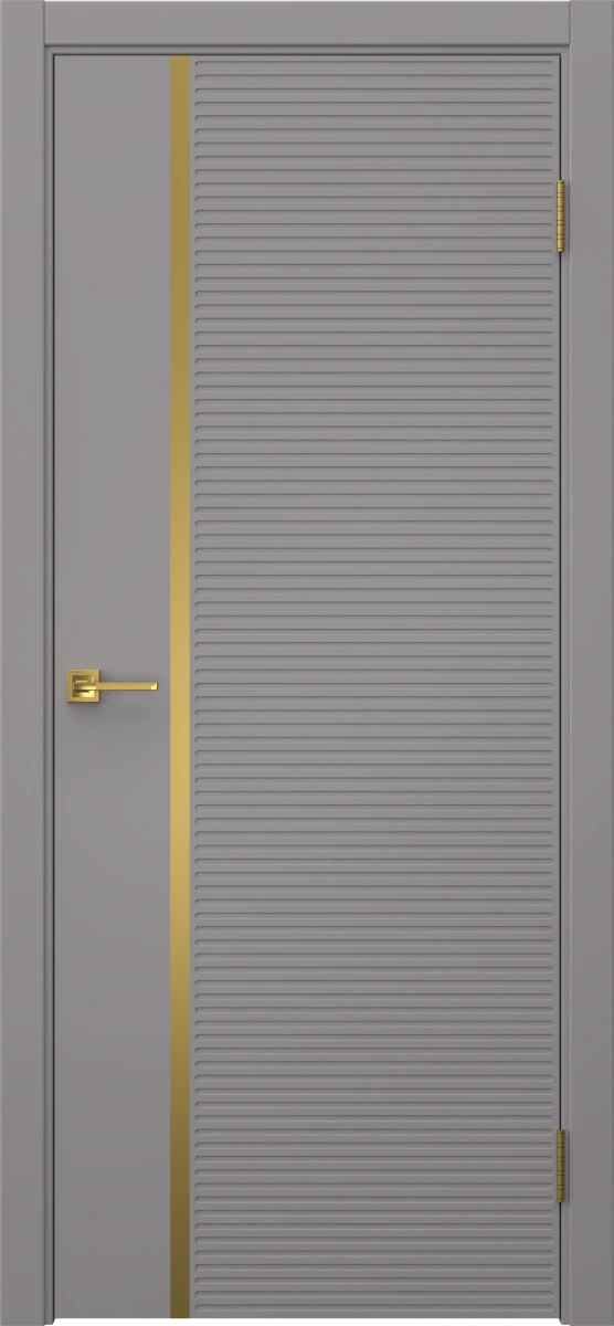 Межкомнатная современная каркасная фрезерованная дверь, покрытая эмалью цвета RAL 7036 (платиново-серый), глухая, с золотым молдингом. Полотно изготовлено из срощенного соснового бруса, сотового наполнителя и МДФ. В комплект входит дверная коробка с телескопическими наличниками. Под заказ производятся двери нестандартных габаритов.