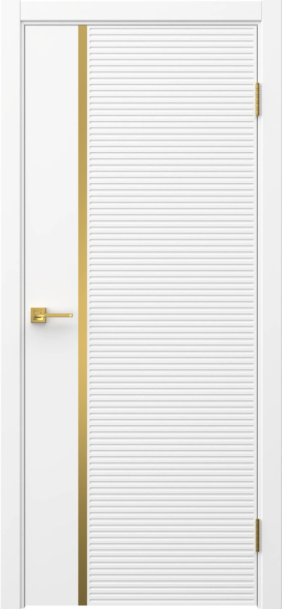 Межкомнатная современная каркасная фрезерованная дверь, покрытая эмалью белого цвета (RAL 9003), глухая, с золотым молдингом. Изготовлена из срощенного бруса сосны, МДФ и сотового наполнителя. Комплектуется дверной коробкой с телескопическими наличниками. Изготавливаются под заказ двери нестандартных размеров.