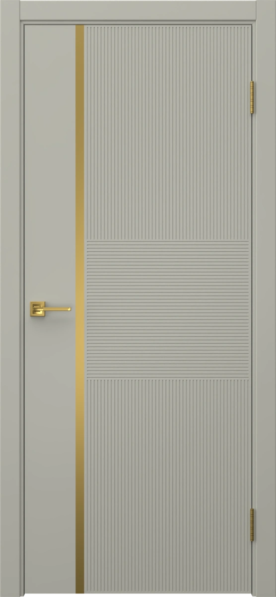 Межкомнатная современная каркасная фрезерованная дверь, покрытая эмалью цвета «графит», глухая, с золотым молдингом. Полотно изготовлено из срощенного соснового бруса, сотового наполнителя и МДФ. В комплект входит дверная коробка с телескопическими наличниками. Возможно изготовление дверей нестандартных размеров.