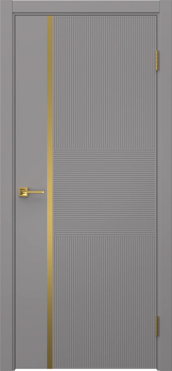 Межкомнатная современная каркасная фрезерованная дверь, покрытая эмалью в цвете RAL 7036 (платиново-серый), глухая, с золотым молдингом. Полотно изготовлено из срощенного соснового бруса, сотового наполнителя и МДФ. Дверная коробка с телескопическими наличниками входит в комплект. Производятся под заказ двери нестандартных размеров.