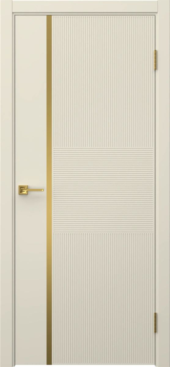 Межкомнатная современная каркасная фрезерованная дверь, покрытая эмалью в цвете RAL 9001 (кремово-белый), глухая, с золотым молдингом. Полотно изготовлено из срощенного соснового бруса, сотового наполнителя и МДФ. Комплектация включает в себя дверную коробку с телескопическими наличниками. Изготавливаются под заказ двери нестандартных размеров.