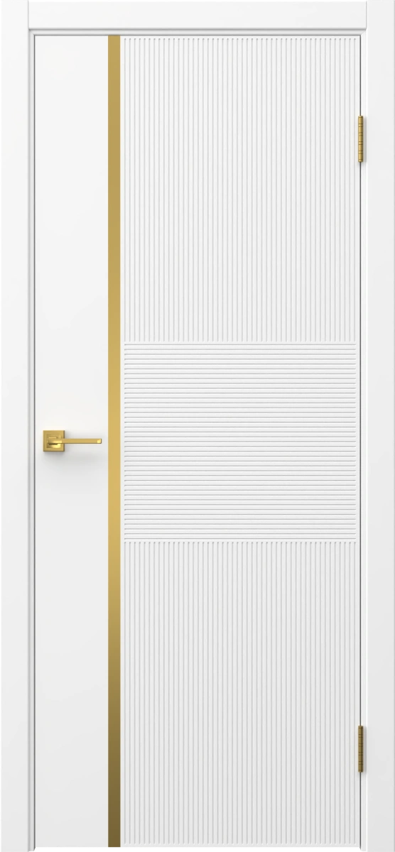 Межкомнатная современная каркасная фрезерованная дверь, покрытая эмалью белого цвета (RAL 9003), глухая, с золотым молдингом. Полотно изготовлено из срощенного бруса сосны, МДФ и сотового наполнителя. Комплектуется дверной коробкой с телескопическими наличниками. Под заказ производятся двери нестандартных габаритов.