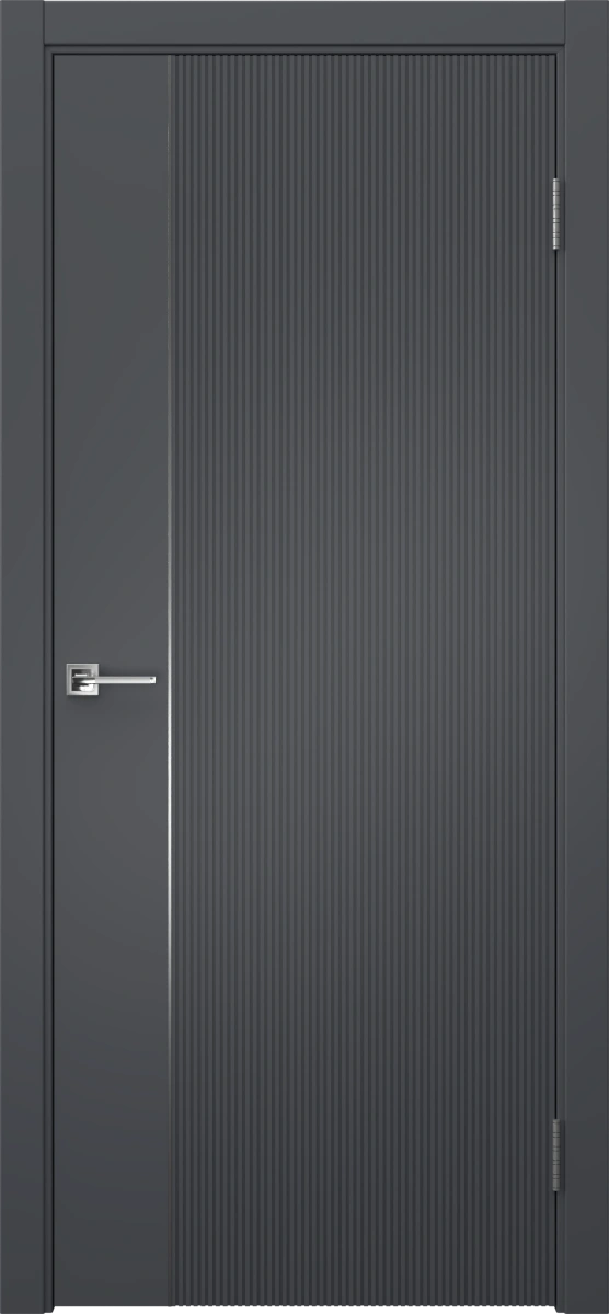 Межкомнатная современная каркасная фрезерованная дверь, покрытая эмалью цвета RAL 7012 (базальтово-серый), глухая, с серебряным молдингом. Полотно изготовлено из срощенного бруса сосны, МДФ и сотового наполнителя. Комплектация включает в себя дверную коробку с телескопическими наличниками. Производятся под заказ двери нестандартных размеров.