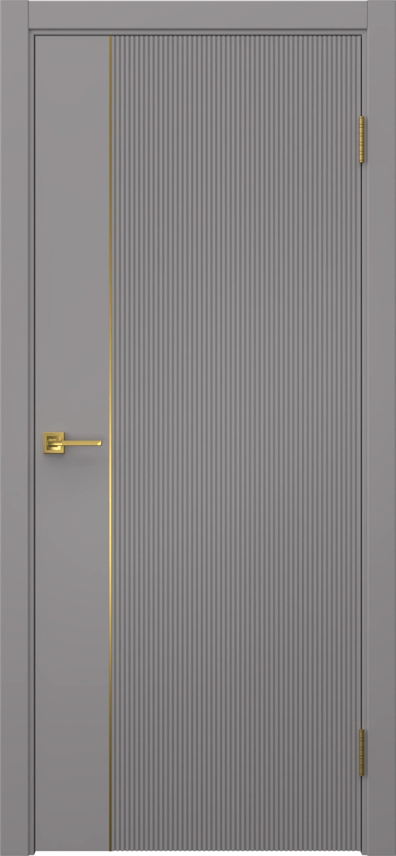 Межкомнатная современная каркасная фрезерованная дверь, покрытая эмалью в цвете RAL 7036 (платиново-серый), глухая, с золотым молдингом. Изготовлена из срощенного соснового бруса, МДФ и сотового наполнителя. Комплектуется дверной коробкой с телескопическими наличниками. Производятся под заказ двери нестандартных размеров.