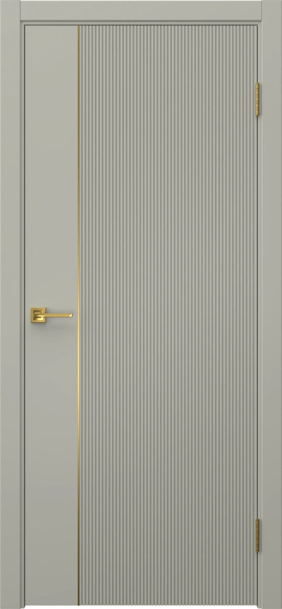 Межкомнатная современная каркасная фрезерованная дверь, покрытая эмалью в цвете RAL 7044 (серый шелк), глухая, с золотым молдингом. Изготовлена из срощенного бруса сосны, МДФ и сотового наполнителя. Комплектуется дверной коробкой с телескопическими наличниками. Производятся под заказ двери нестандартных размеров.