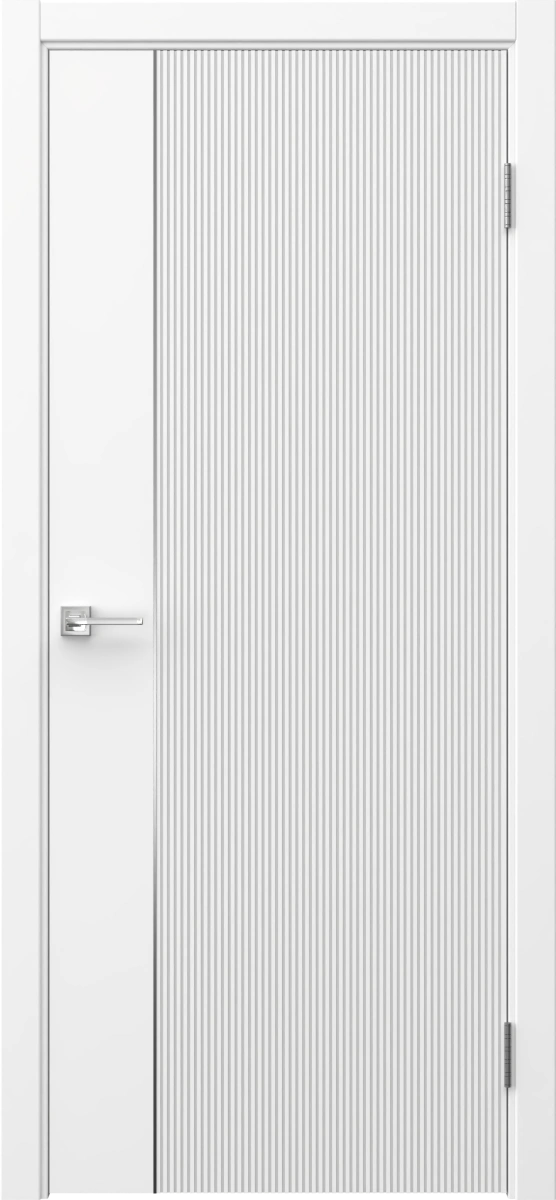 Межкомнатная современная каркасная фрезерованная дверь, покрытая эмалью белого цвета (RAL 9003), глухая, с серебряным молдингом. Полотно изготовлено из срощенного бруса сосны, МДФ и сотового наполнителя. Комплектация включает в себя дверную коробку с телескопическими наличниками. Под заказ производятся двери нестандартных габаритов.