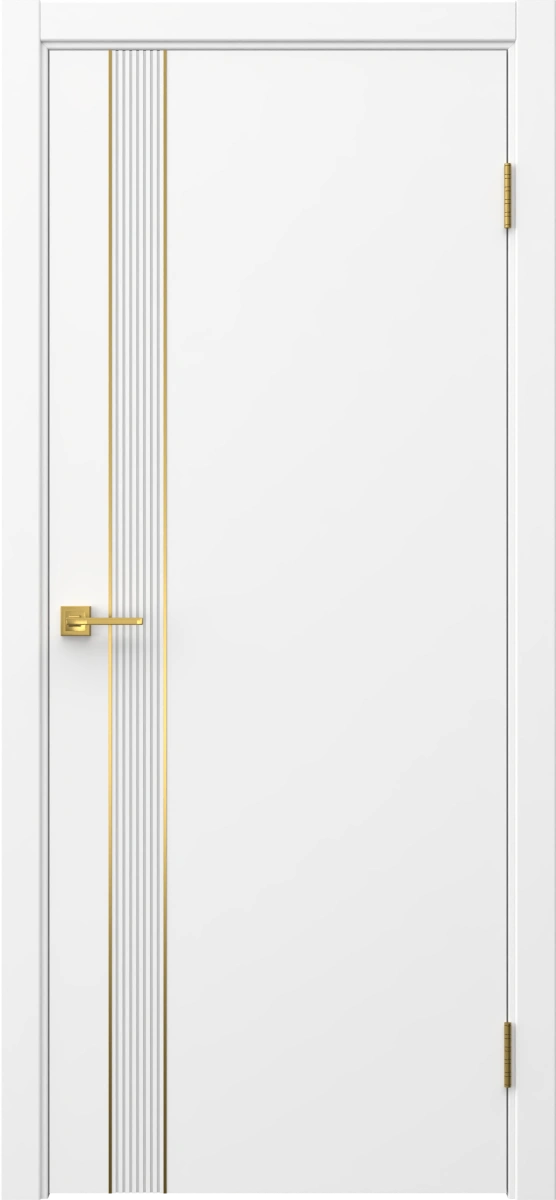 Межкомнатная современная каркасная фрезерованная дверь, покрытая эмалью белого цвета (RAL 9003), глухая, с золотым молдингом. Изготовлена из срощенного бруса сосны, МДФ и сотового наполнителя. Комплектация включает в себя дверную коробку с телескопическими наличниками. Производятся под заказ двери нестандартных размеров.