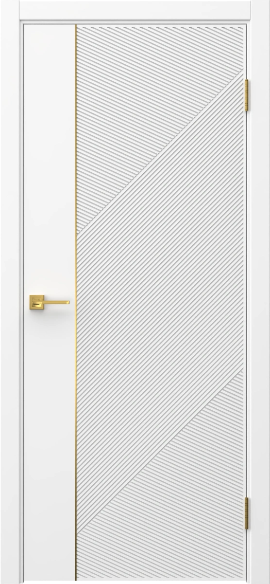 Межкомнатная современная каркасная фрезерованная дверь, покрытая эмалью белого цвета (RAL 9003), глухая, с золотым молдингом. Полотно изготовлено из срощенного бруса сосны, МДФ и сотового наполнителя. В комплект входит дверная коробка с телескопическими наличниками. Под заказ производятся двери нестандартных габаритов.