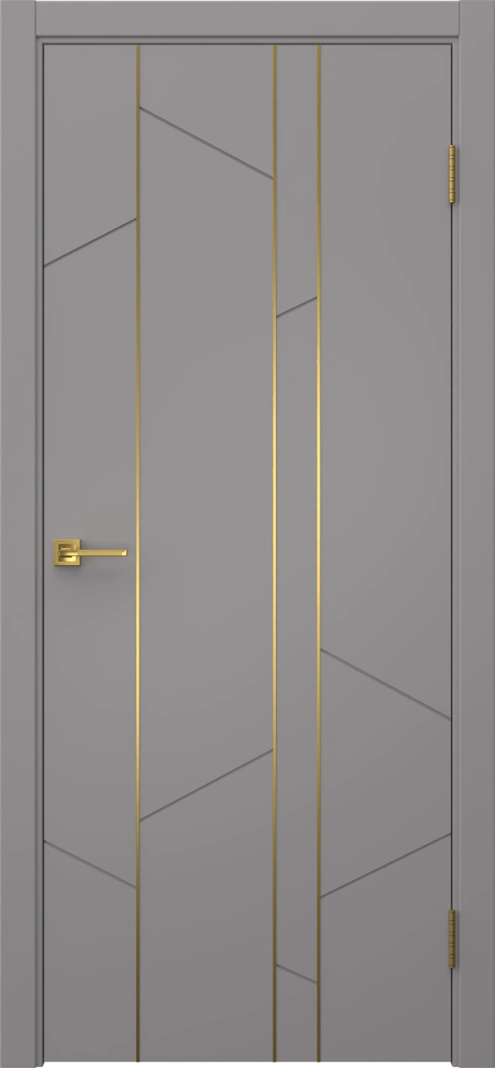 Межкомнатная современная каркасная фрезерованная дверь, покрытая эмалью цвета RAL 7036 (платиново-серый), глухая, с золотым молдингом. Полотно изготовлено из срощенного бруса сосны, МДФ и сотового наполнителя. В комплект входит дверная коробка с телескопическими наличниками. Изготавливаются под заказ двери нестандартных размеров.