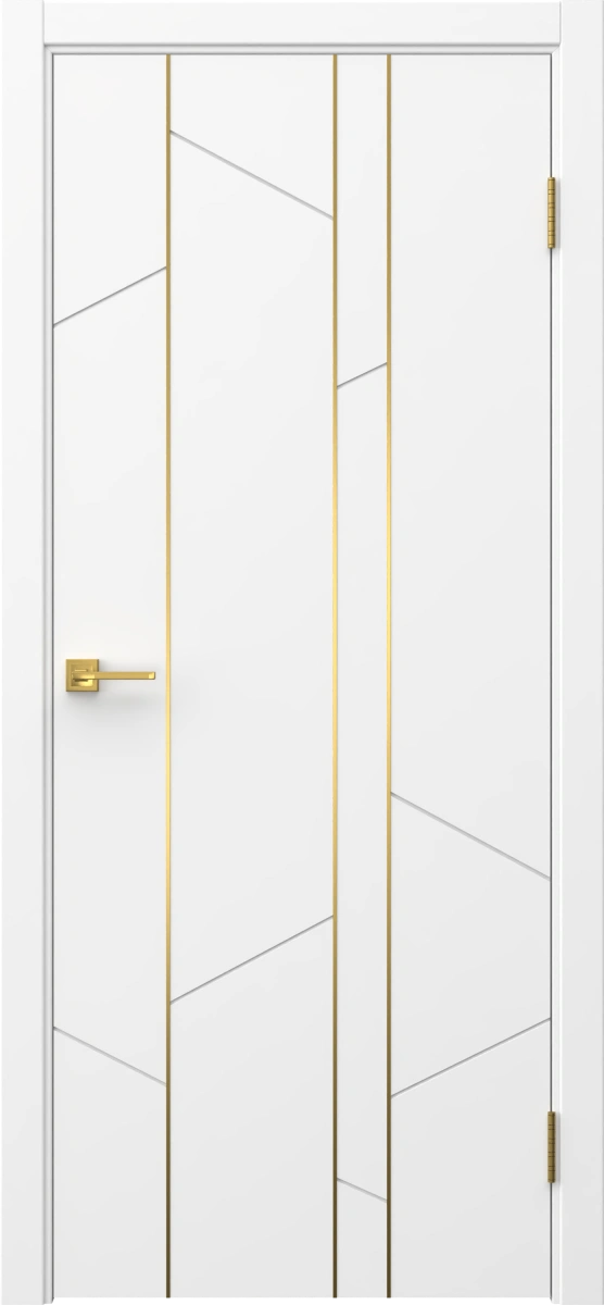 Межкомнатная современная каркасная фрезерованная дверь, покрытая эмалью белого цвета (RAL 9003), глухая, с золотым молдингом. Полотно изготовлено из срощенного бруса сосны, МДФ и сотового наполнителя. Комплектуется дверной коробкой с телескопическими наличниками. Возможно изготовление дверей нестандартных размеров.