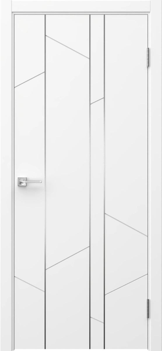 Межкомнатная современная каркасная фрезерованная дверь, покрытая эмалью белого цвета (RAL 9003), глухая, с серебряным молдингом. Полотно изготовлено из срощенного соснового бруса, сотового наполнителя и МДФ. В комплект входит дверная коробка с телескопическими наличниками. Возможно изготовление дверей нестандартных размеров.