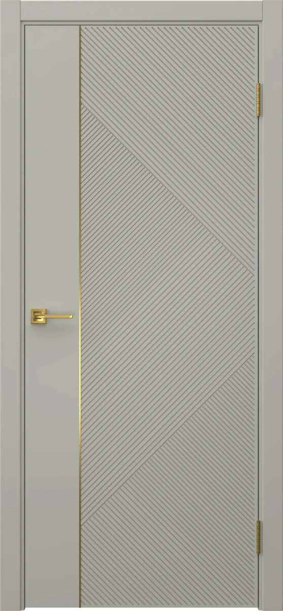Межкомнатная современная каркасная фрезерованная дверь, покрытая эмалью в цвете RAL 7044 (серый шелк), глухая, с золотым молдингом. Изготовлена из срощенного соснового бруса, МДФ и сотового наполнителя. Дверная коробка с телескопическими наличниками входит в комплект. Под заказ производятся двери нестандартных габаритов.