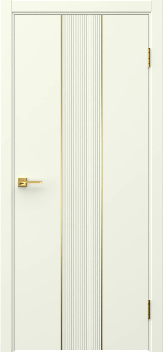 Межкомнатная современная каркасная фрезерованная дверь, покрытая эмалью белого цвета (RAL 9010), глухая, с золотым молдингом. Изготовлена из срощенного бруса сосны, МДФ и сотового наполнителя. Комплектуется дверной коробкой с телескопическими наличниками. Под заказ производятся двери нестандартных габаритов.