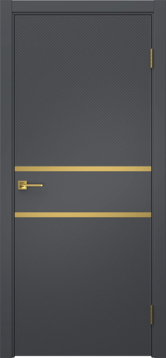 Межкомнатная современная каркасная фрезерованная дверь, покрытая эмалью в цвете «графит», глухая, с золотым молдингом. Изготовлена из срощенного бруса сосны, МДФ и сотового наполнителя. Комплектация включает в себя дверную коробку с телескопическими наличниками. Под заказ производятся двери нестандартных габаритов.
