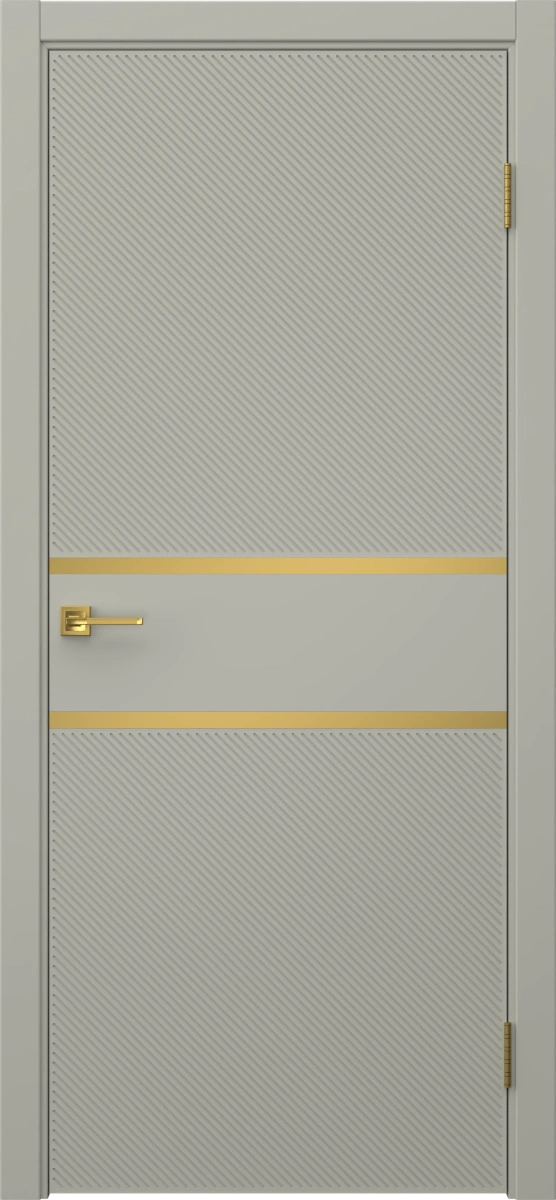Межкомнатная современная каркасная фрезерованная дверь, покрытая эмалью в цвете RAL 7044 (серый шелк), глухая, с золотым молдингом. Полотно изготовлено из срощенного соснового бруса, сотового наполнителя и МДФ. Комплектация включает в себя дверную коробку с телескопическими наличниками. Возможно изготовление дверей нестандартных размеров.