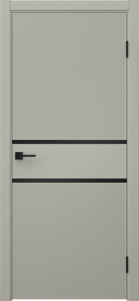 Межкомнатная современная каркасная фрезерованная дверь, покрытая эмалью цвета RAL 7044 (серый шелк), глухая, с черным молдингом. Полотно изготовлено из срощенного соснового бруса, сотового наполнителя и МДФ. Комплектация включает в себя дверную коробку с телескопическими наличниками. Под заказ производятся двери нестандартных габаритов.
