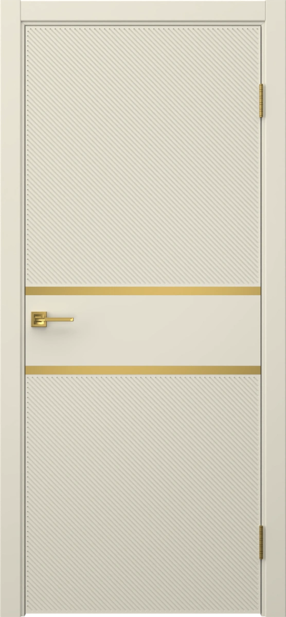 Межкомнатная современная каркасная фрезерованная дверь, покрытая эмалью цвета RAL 9001 (кремово-белый), глухая, с золотым молдингом. Изготовлена из срощенного бруса сосны, МДФ и сотового наполнителя. Комплектуется дверной коробкой с телескопическими наличниками. Изготавливаются под заказ двери нестандартных размеров.
