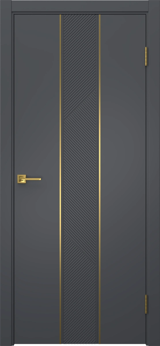 Межкомнатная современная фрезерованная каркасная дверь, покрытая эмалью в цвете «графит», глухая, с золотым молдингом. Полотно изготовлено из срощенного соснового бруса, сотового наполнителя и МДФ. Комплектация включает в себя дверную коробку с телескопическим наличником. Производятся под заказ двери нестандартных размеров.