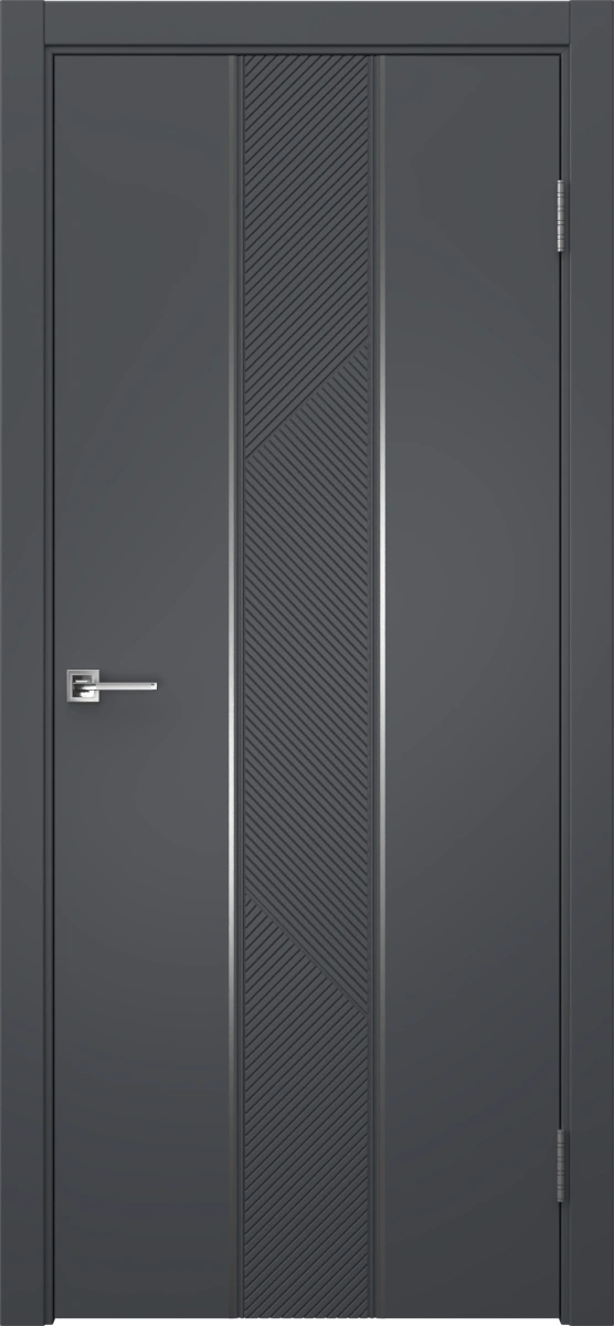 Межкомнатная современная фрезерованная каркасная дверь, покрытая эмалью в цвете «графит», глухая, с серебряным молдингом. Полотно изготовлено из срощенного бруса сосны, МДФ и сотового наполнителя. Комплектуется дверной коробкой с телескопическим наличником. Производятся под заказ двери нестандартных размеров.