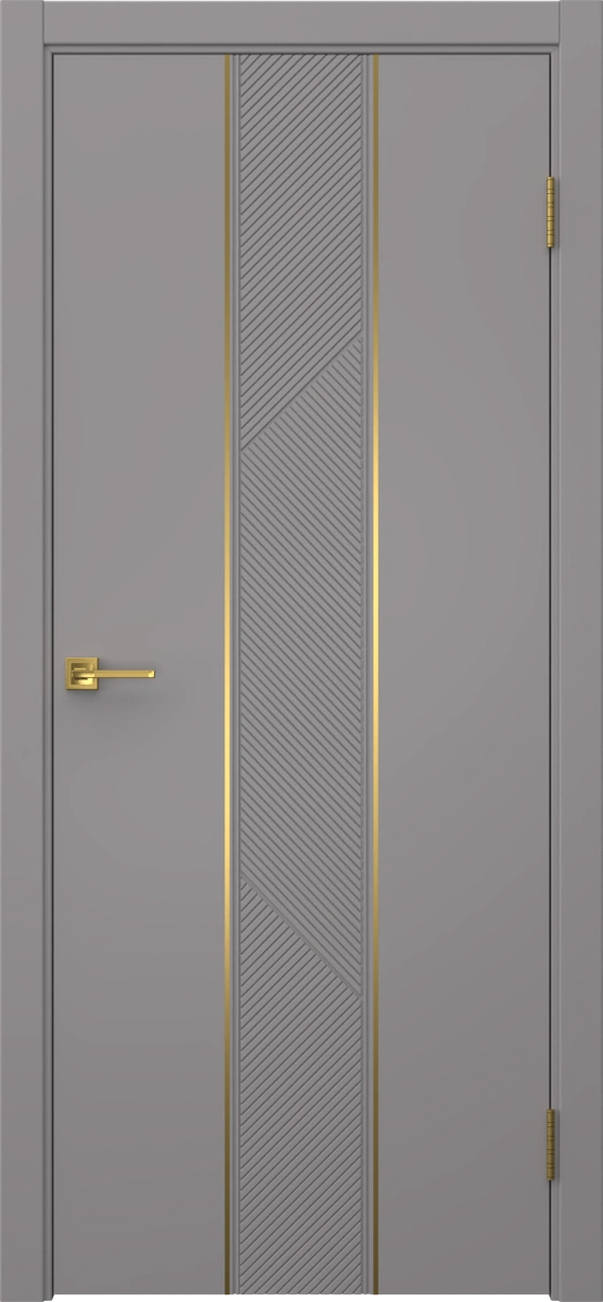 Межкомнатная современная фрезерованная каркасная дверь, покрытая эмалью цвета RAL 7036 (платиново-серый), глухая, с золотым молдингом. Изготовлена из срощенного бруса сосны, МДФ и сотового наполнителя. Дверная коробка с телескопическим наличником входит в комплект. Изготавливаются под заказ двери нестандартных размеров.