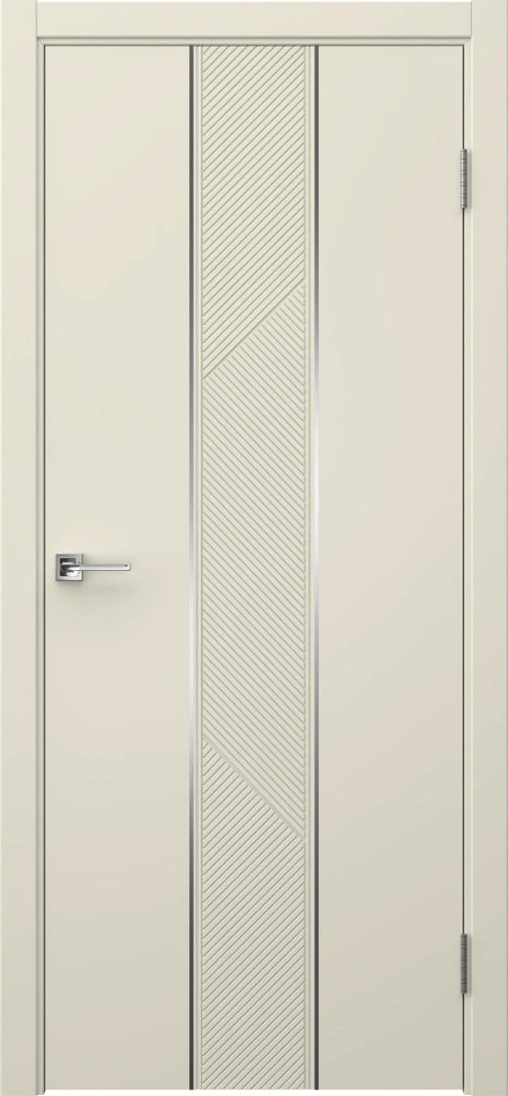 Межкомнатная современная фрезерованная каркасная дверь, покрытая эмалью цвета RAL 9001 (кремово-белый), глухая, с серебряным молдингом. Изготовлена из срощенного бруса сосны, МДФ и сотового наполнителя. В комплект входит дверная коробка с телескопическим наличником. Производятся под заказ двери нестандартных размеров.